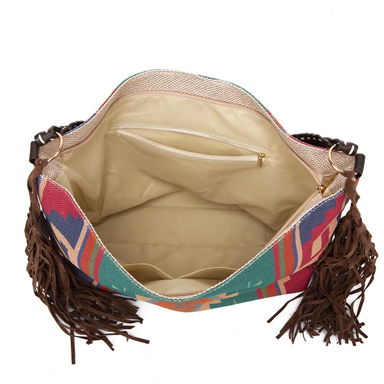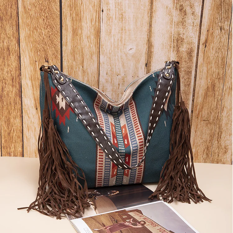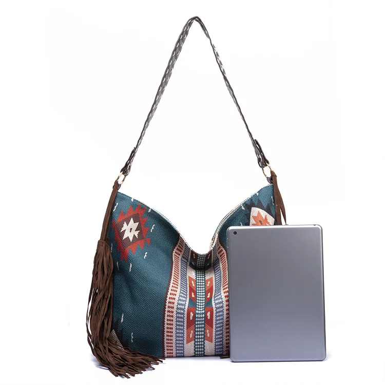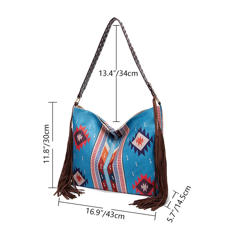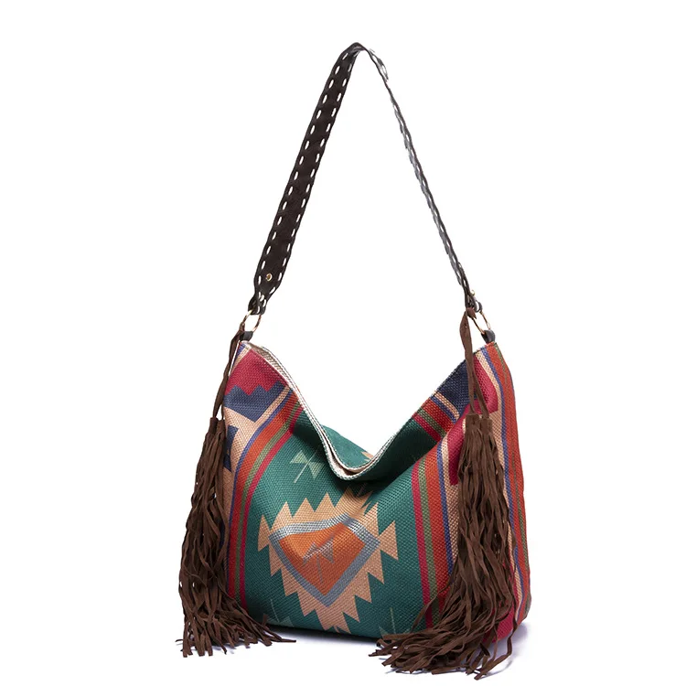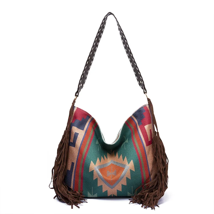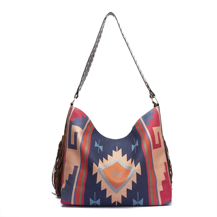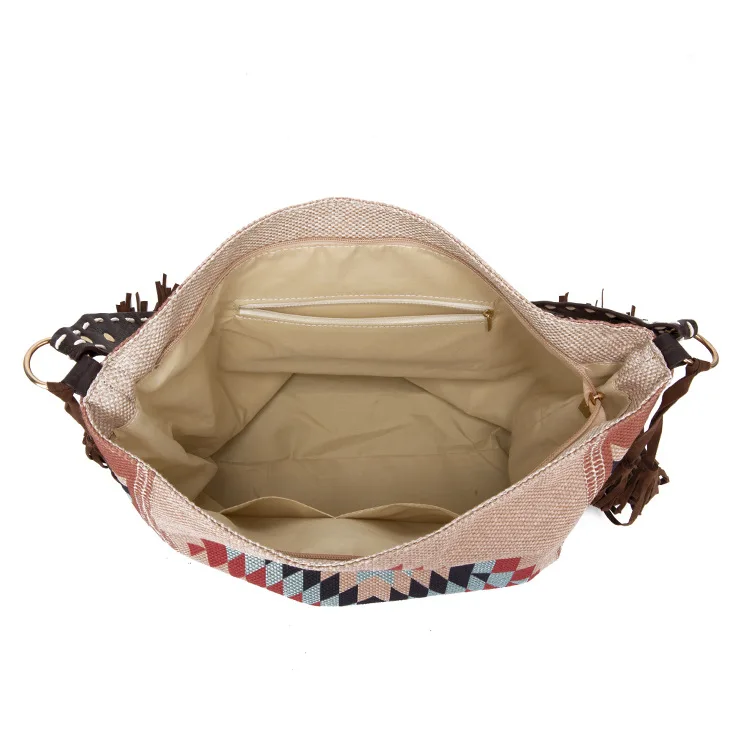 Bohemian Large Capacity Tote Bag Vintage Canvas Women Shoulder BagsTassel Geometric Patterns Crossbody Bag Big Shopper Purses